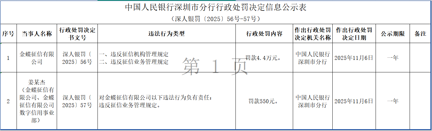 中国经济网北京11月25日讯 中国人民银行深圳市分行近期发布行政处罚决定信息公示表(深人银罚〔2025〕56号-57号)。金蝶征信有限公司存在以下违法行为:一、违反征信机构管理规定;二、违反征信业务管理规定。中国人民银行深圳市分行决定对其处以罚款4.4万元。