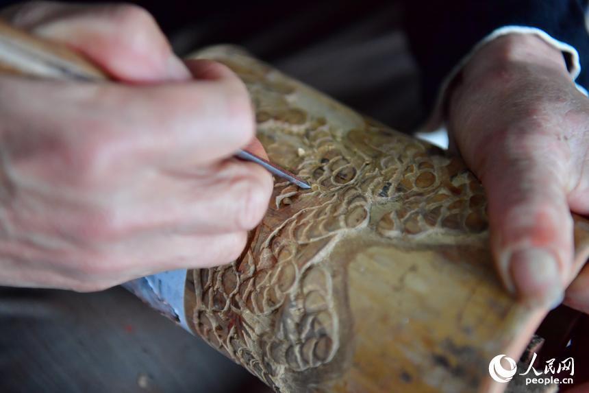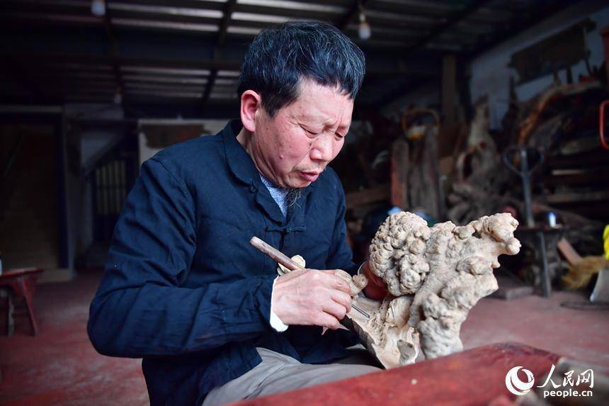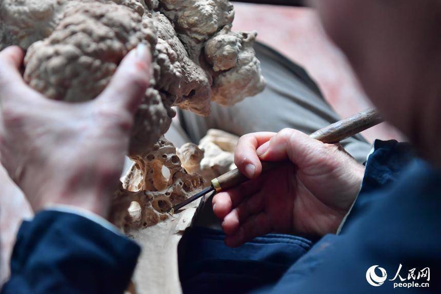 刘四喜正在进行根雕创作。人民网记者 时雨摄
