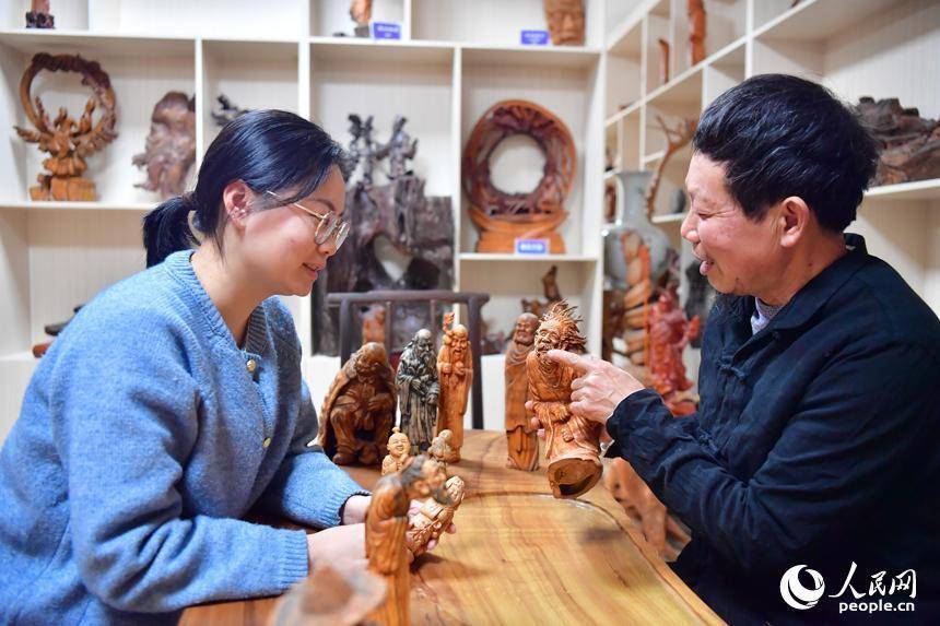 刘四喜向游客介绍根雕创作历程。人民网记者 时雨摄