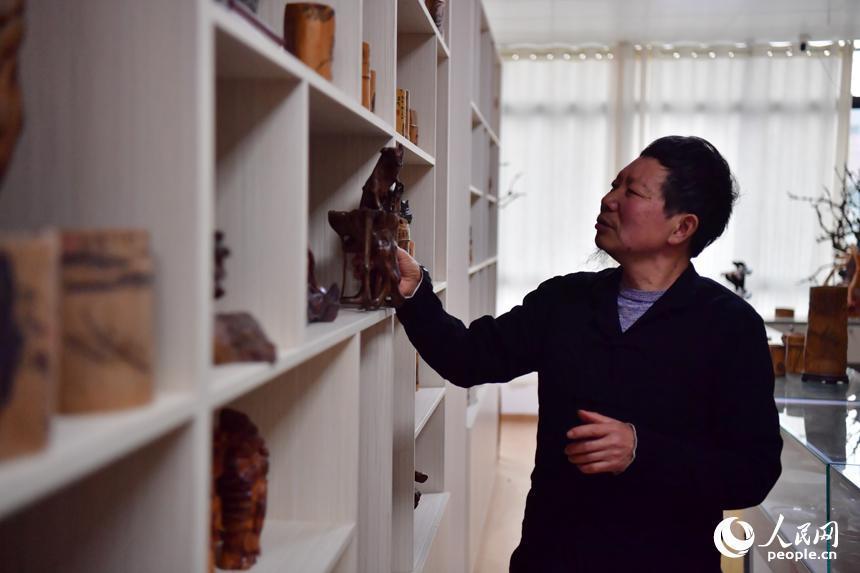 刘四喜整理根雕。人民网记者 时雨摄